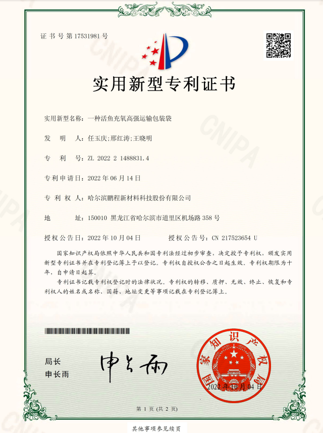 一種活魚充氧高強運輸包裝袋-證書號第17531981號